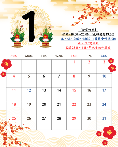 以前からおしらせしておりましたが、12月28日(日)~1月4日(日)の間、年末年始休業日となります。多くのお客様にご不便、ご迷惑をおかけいたしますがご理解いただきますようお願いいたします。1月5日(月)からは通常営業となっております。1月5日以降のご予約も受け付けておりますので、年明けのご予約をご希望の方もぜひお問い合わせください。